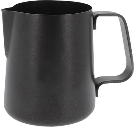 Egyszerű és funkcionális fekete tejeskancsó a latte art számára.   18/8 rozsdamentes acélból készül. Ideális a cappuccino díszítéséhez. A kiöntő alakja megkönnyíti a dekoráció elkészítését, a fogantyú dőlése és alakja lehetővé teszi a csukló könnyű mozgatását, a kúpos forma kedvez a tejhab áramlásának.